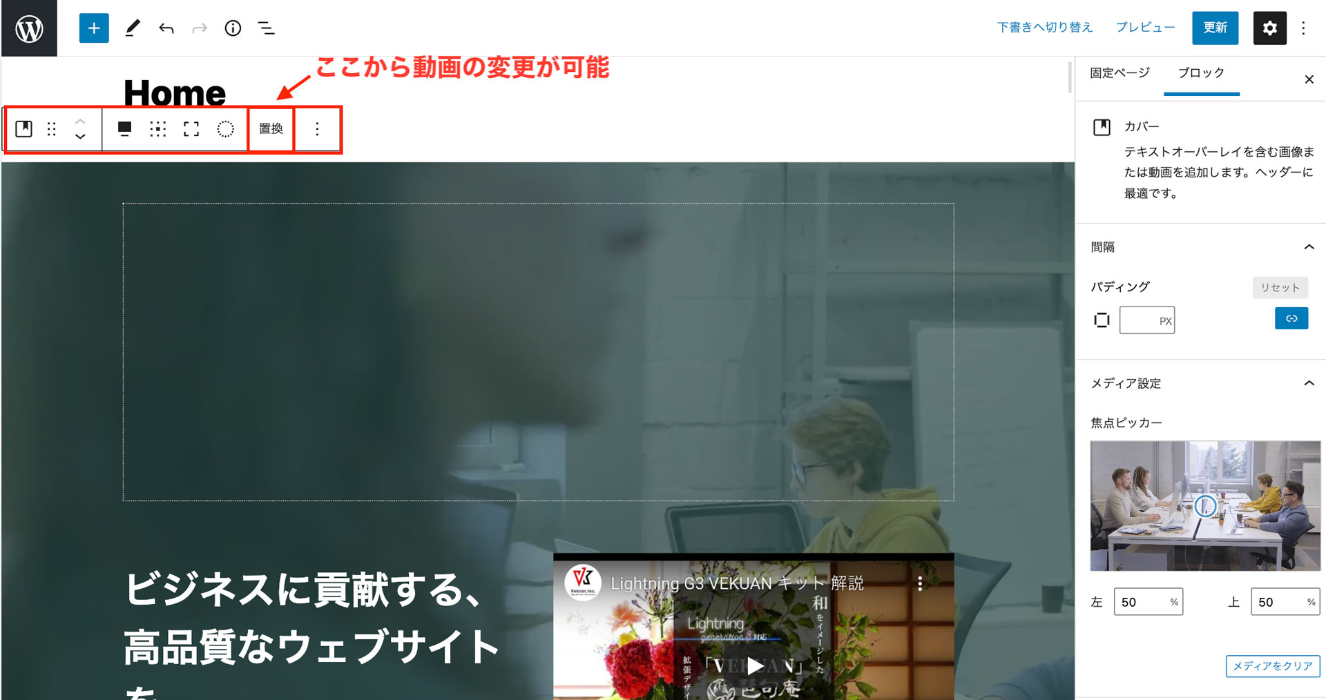 ファーストビューの動画は、WordPress標準のカバーブロックで配置しています。固定ページから簡単に編集が可能です。カバーブロックを選択して「置換」からメディアにアップロードした任意の動画に置き換えてください。